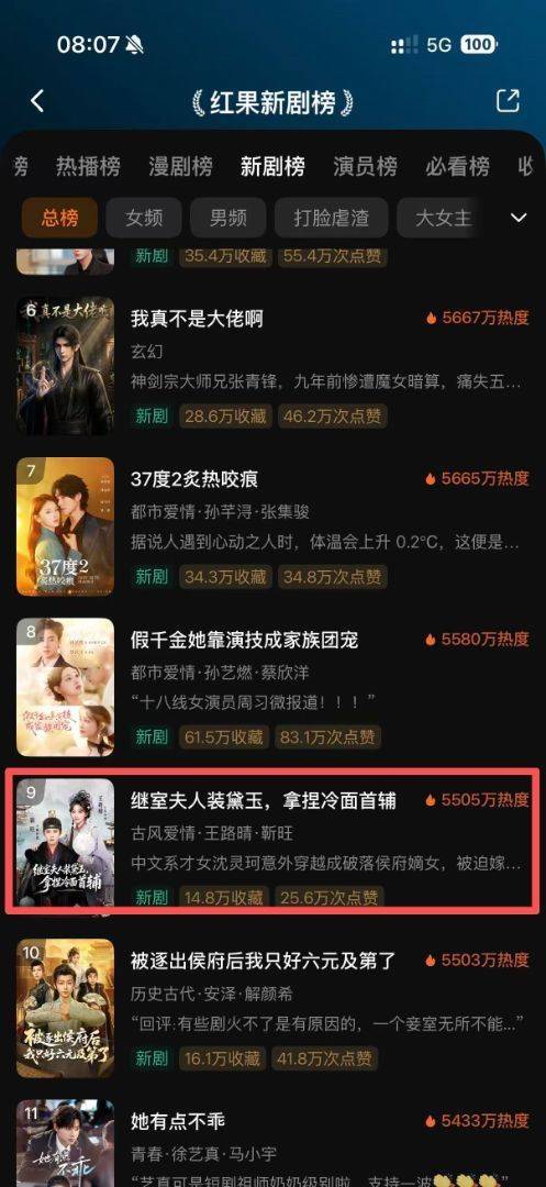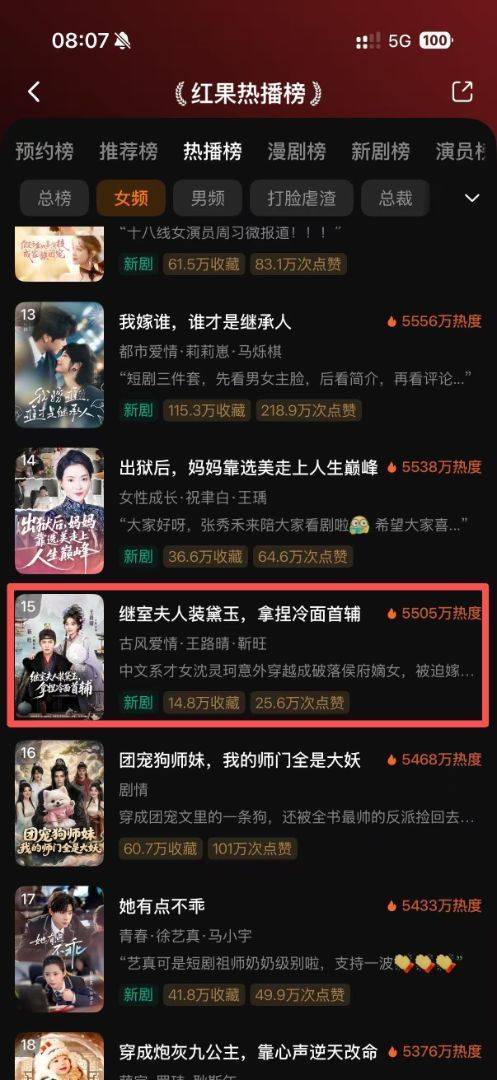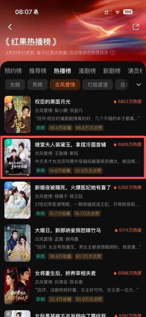 根据红果短剧最新榜单数据,该剧上线后迅速跻身平台核心榜单前列:在红果新剧总榜中位列第9位,女频热播榜稳居第15名,更在古风爱情细分赛道强势冲至第2位,以5505万的超高热度领跑同期新剧。