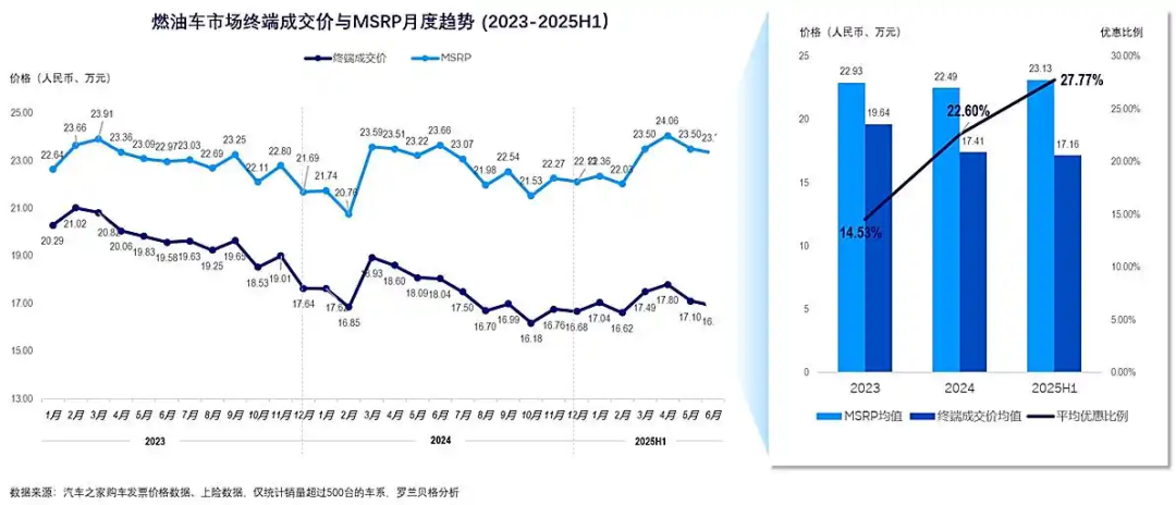 而车价还在持续下滑。咨询机构罗兰贝格发布的《中国乘用车量价趋势与营销策略研究报告2025》显示,今年上半年,中国乘用车市场终端平均成交价从2023年19.64万元下跌至17.16万元,相应的终端优惠幅度自2023年的14.53%一路扩大至今年上半年的27.77%。