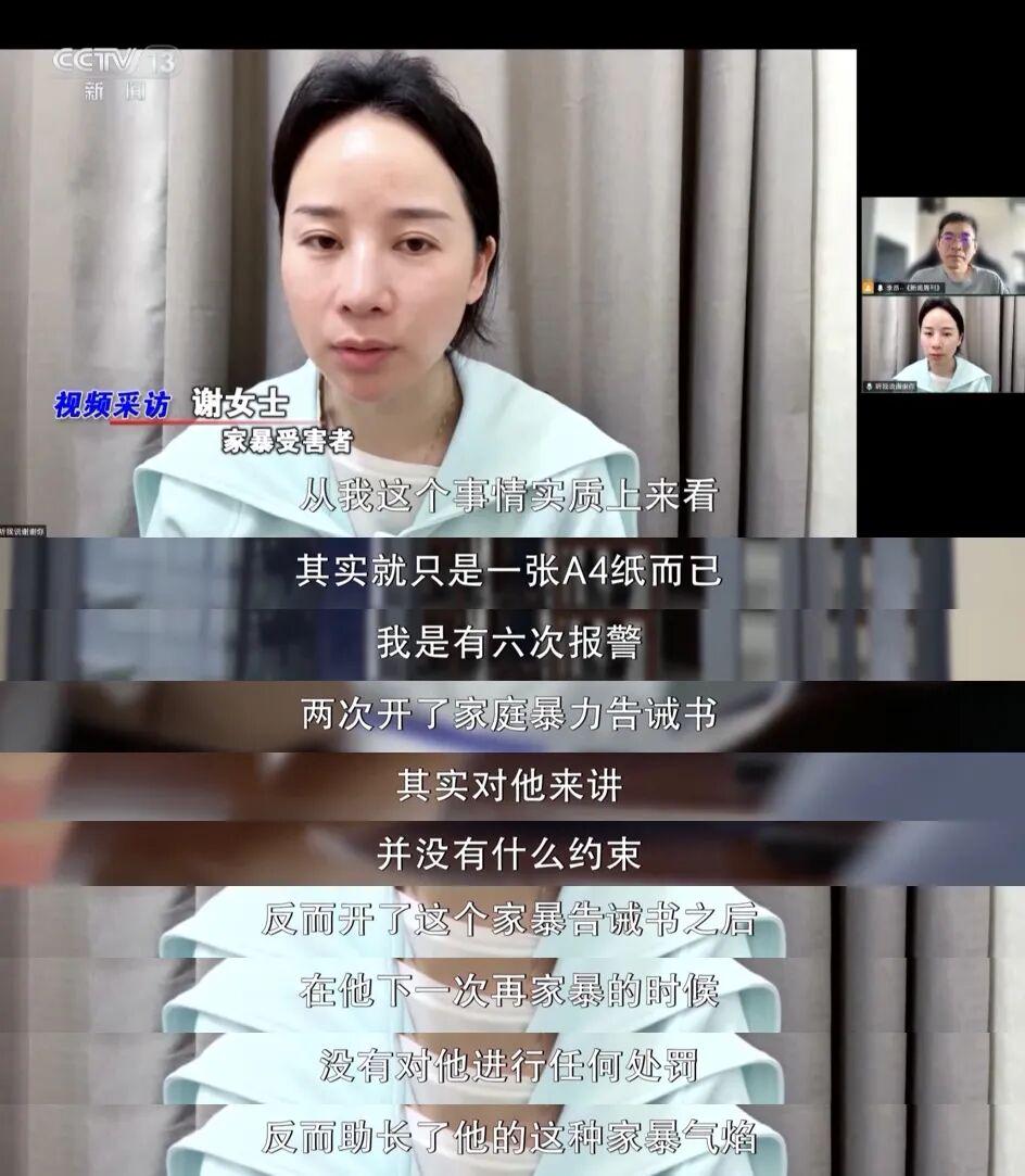 丈夫的暴力,开始于谢女士怀孕八个月的时候,一次争吵之后,丈夫便对她大打出手,随后便一发不可收拾,回家的时间、日常的开销,甚至穿衣的习惯,都会引发丈夫的拳打脚踢。忍无可忍的谢女士,选择了报警,第一次报警,警方口头警告,第二次报警,警方向她丈夫开出了《家庭暴力告诫书》。